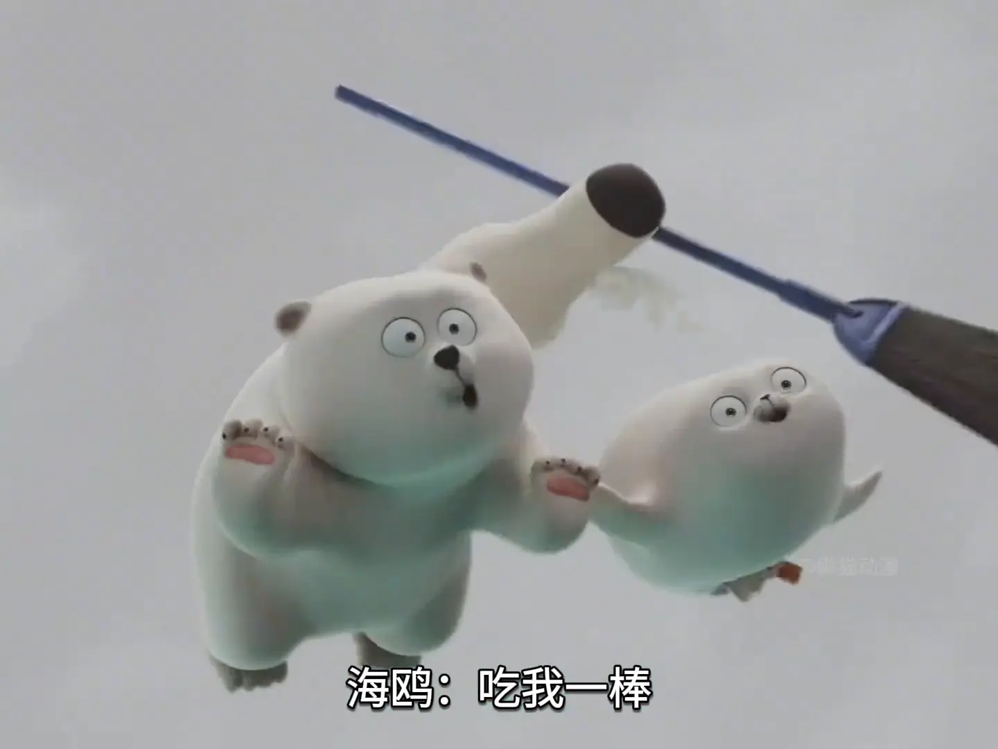 这时它们被一个奇特生物吸引,好奇心极重的北极熊打开才发现里面藏着一只海鸥,不过看它的眼神不像善茬,听着海鸥的怪笑它们被吓傻了,急忙盖住开溜。海鸥把帽子当做武器投掷出去,紧接着对准两个小家伙猛啄,打的它们抱头鼠窜不断寻找东西掩护。